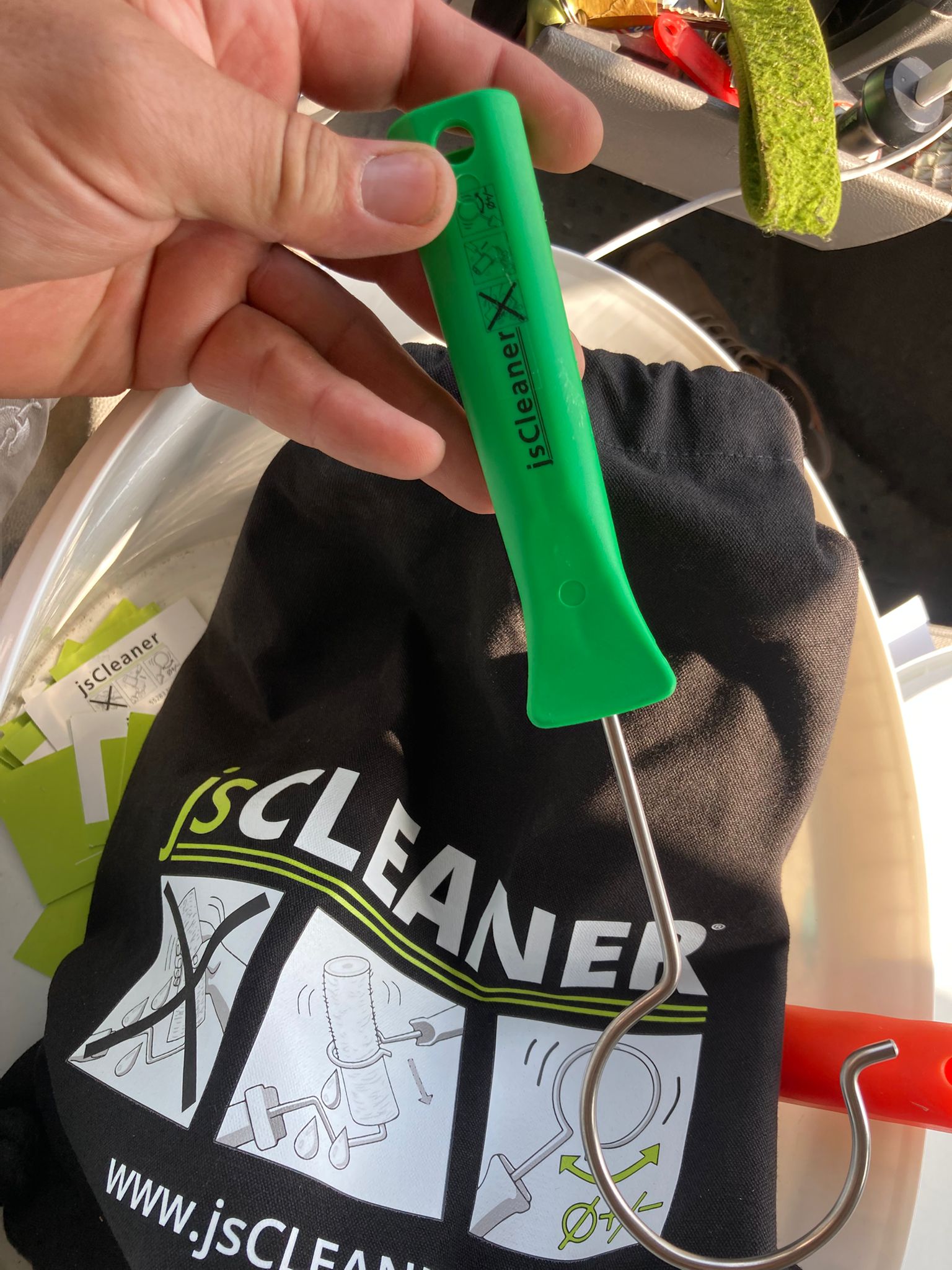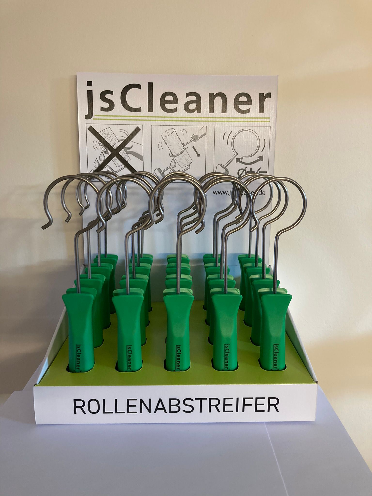 Einfach und genial – der kleine Helfer für die Baustelle. Der jsCleaner macht Schluss mit umständlichem Rollenreinigen. Einfach Abstreifen und weiter arbeiten oder gründlich reinigen. Kein lästiges Ausdrücken der Rollen von Hand mehr. Das schont Nerven, Zeit und die Umwelt. Darüber hinaus hält es Kleidung und Arbeitsbereich durch weniger Farb- und Lackspritzer sauber, und der verminderte Kontakt zu Lacken und Farben kommt auch ihrer Gesundheit zu Gute.
